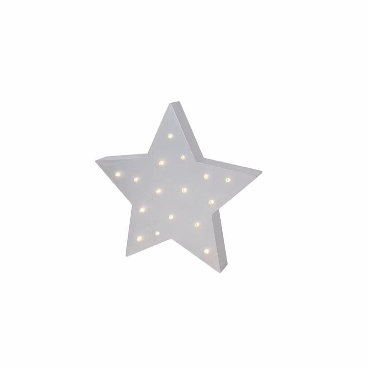 Stilren och snygg lampa i form av en stjärna med små ljuspunkter i. Ger ett behagligt ljus i barnrummet och är lika fin även när den inte är tänd. Lampan går lika bra att ha stående på sängbordet eller i fönstret som att hänga på väggen.