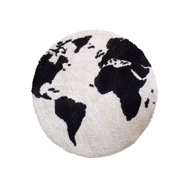 En underbar mjuk matta med världskartan i svart. Undersidan är av gummi så mattan ligger på plats. Passar lika bra mitt på golvet som i ett tipitält eller i en sänghimmel.