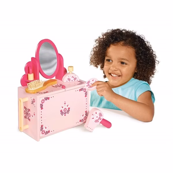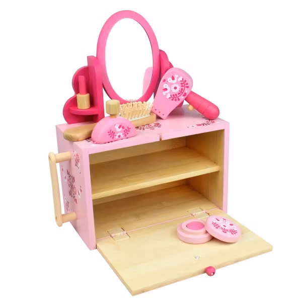 Ett underbart sminkset i trä som innehåller spegel, hårtork, läppstift, puder samt kam. En smart bok med förvaring som gör den superenkel att ta med på resan. En leksak som hjälper barnen på ett roligt sätt att öka sin kognitiva förmåga, sin finmotorik och fantasi.